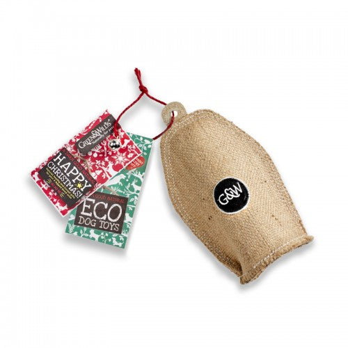This toy has four layers of jute twin stitched over a recycled plastic water bottle. The sound of the plastic crunching underneath the jute is incredibly appealing to dogs, and they can have hours of fun with it.