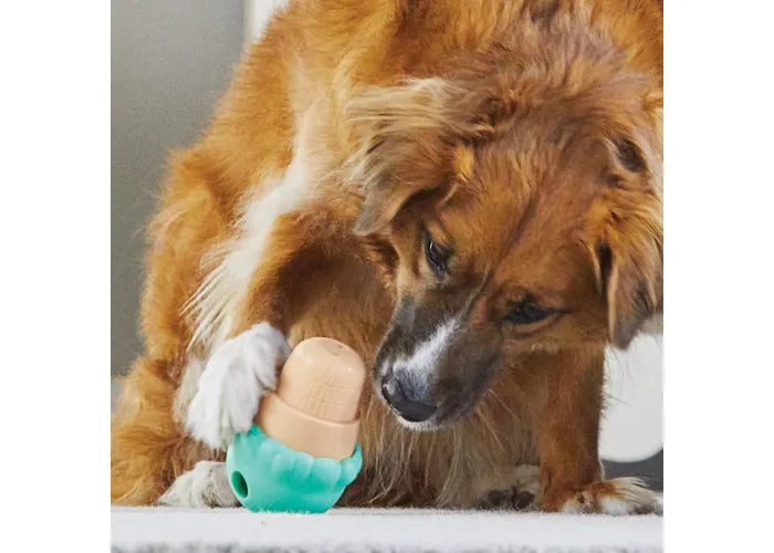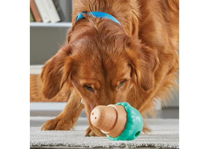 - As they bat around the wiggling, wobbling ice cream cone to release the food inside, dogs will use their brains to solve this treat dispensing dog toy's puzzling challenge and keep their brains boredom-free.