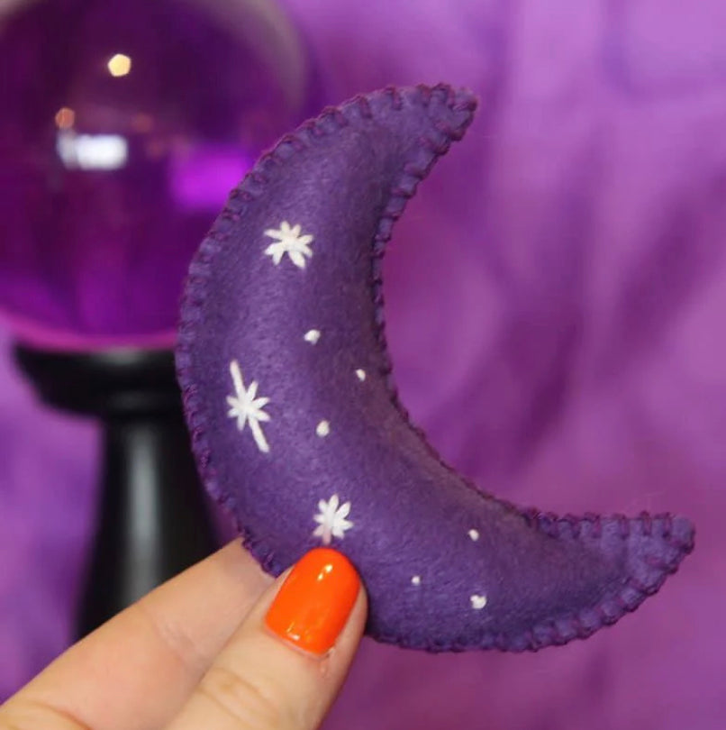 Handmade purple moon cat toy filled with toy stuffing made from recycled bottles. This design has embroidered star detailing on it, to make it all the more special! The felt used is vegan, so it contains no wool! These make the purrfect gift for your magical kitties!
